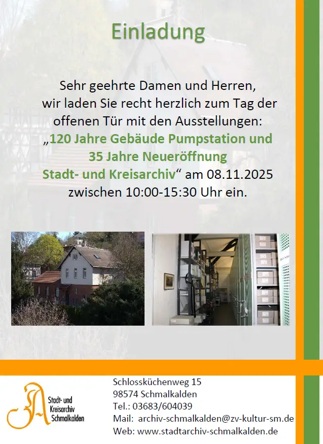 Wir laden Sie recht herzlich ein zum Tag der offenen Tür im Stadt-und Kreisarchiv Schmalkalden, der unter dem Motto von 2 Jubiläen steht: